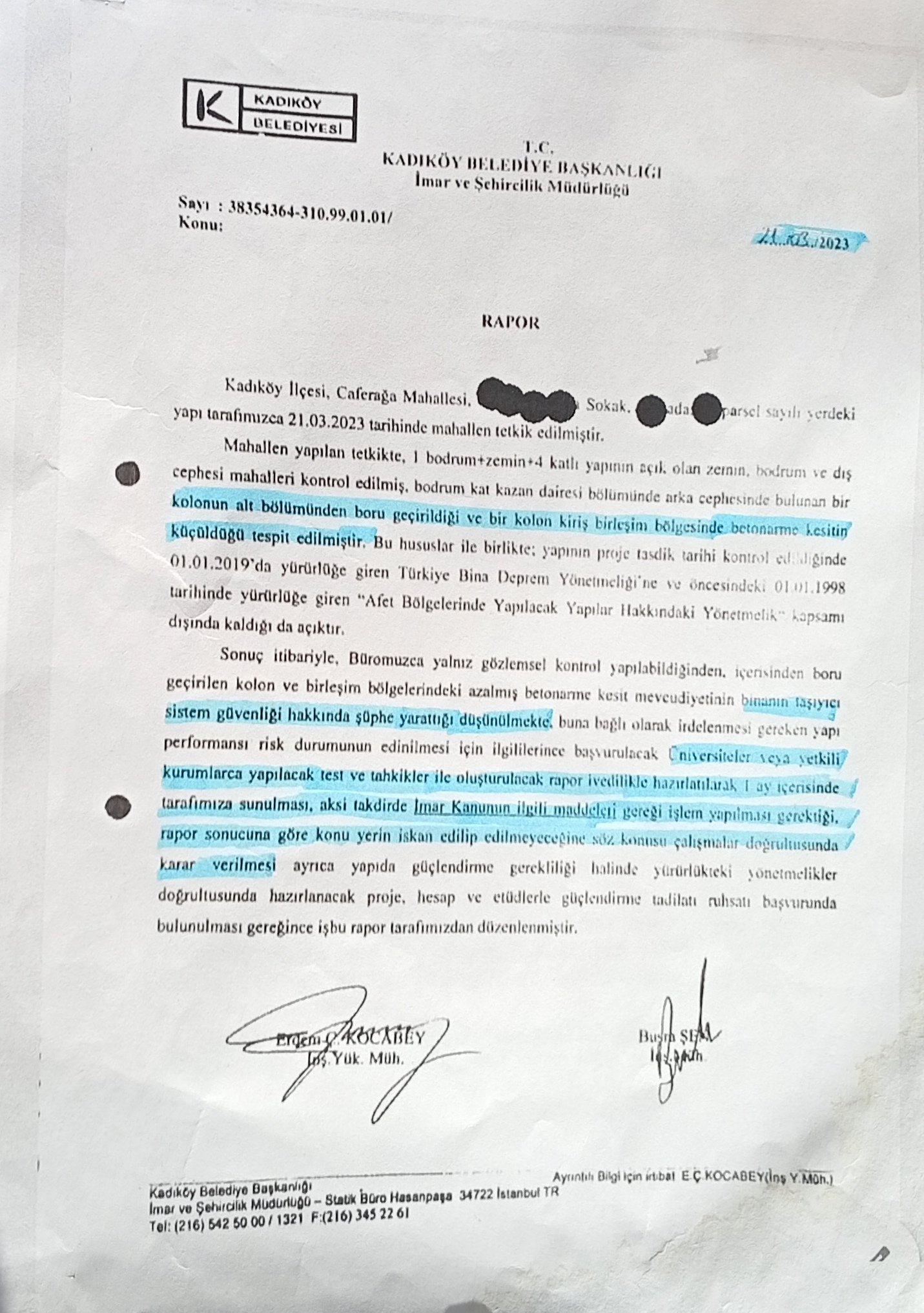 Rapora göre şart olan güçlendirme ruhsatı alınmadan, tasiyici sistemi supheli binada oturum için şart olan üniversite raporunu almamak için örtbas amaçlı