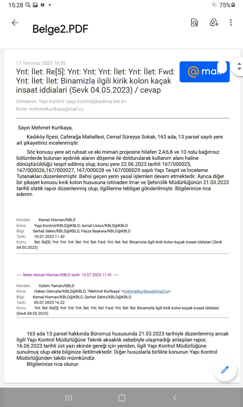Bu rapor burada ( hhttp://www.emeksinemasiniyasatalim.org/modadahukuksuzapartman.htm ) ve belediyeye yazdigim israrli yazilar/yayinladigim deliller sonucunda 5 Temmuz 2023'te bana Kadikoy Belediyesi Imar ve Sehircilik mudurlugunden yollandi, ancak belediye bu sefer de raporu ısrarla uygulamayarak örtbası devam ettirdi.