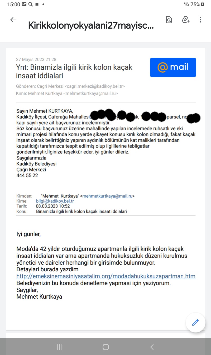 ![]() X /Twitter @emeksinema Mehmet Kurtkaya - Telegram Gecekonduda Olmayacak Hukuksuzluklar Moda'da - Moda Suç ApartmanıMehmet Kurtkaya8 Mart 2023 Son güncelleme: 31 Agustos 2025 "Beş yıldır İstanbul, Kadıköy Moda'da oturduğum binadaki sistematik yolsuzluk ve hukuksuzluklarla mücadele ediyorum. Gerçekleri ortaya çıkardığım için ise hukuki darbeler ve Türkiye Cumhuriyeti'nin ciddi insan hakları ihlalleriyle karşılaşıyorum. Resmi Kadıköy Belediyesi raporuna göre taşıyıcı sistemi şüpheli olan 49 yıllık bu 'tabut binada' depremleri yaşamak zorunda bırakıldım; burada sıkışıp kaldım. Oysa rapora göre, bu bina iki yıl önce tahliye edilmeli ve yıkılmalıydı. İki buçuk yıldır süren bu resmi rapor örtbası, devlet kurumlarının sessizliği ve hukuk süreçlerinin anayasal haklarımı ihlal edecek şekilde işletilmesi nedeniyle, 20 Mayıs 2025'te Birleşmiş Milletler İnsan Hakları Ofisi'ne başvurdum. İddialarımı kanıtlayan resmi belgeleri yazının devamında bulabilirsiniz. Orijinal İngilizce BM Formu - (Yapay Zeka Türkçe Çevirisi)" Moda Suç Apartmanı'ndaki 4 dairenin TSK bağlantısı ve maalesef kardeşimin bu örtbasa katılımı gibi bir tabloyla karşı karşıyayım. GirişBu sayfa ikibucuk senedir devam eden guncellemeler nedeniyle cok uzun, o nedenle bir sayfalik giris ve dilerseniz ilaveten 1.5 sayfalik ozet bolumunu okusaniz yeter.Kadıköy Belediyesi'nin (Istanbul) Kahramanmaraş depreminden bir ay sonra resmen riskli ilan ettiği denize yakın, 49 yıllık, deniz kumuyla yapılmış bu binada: