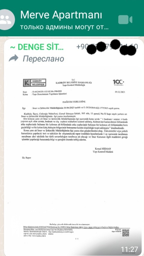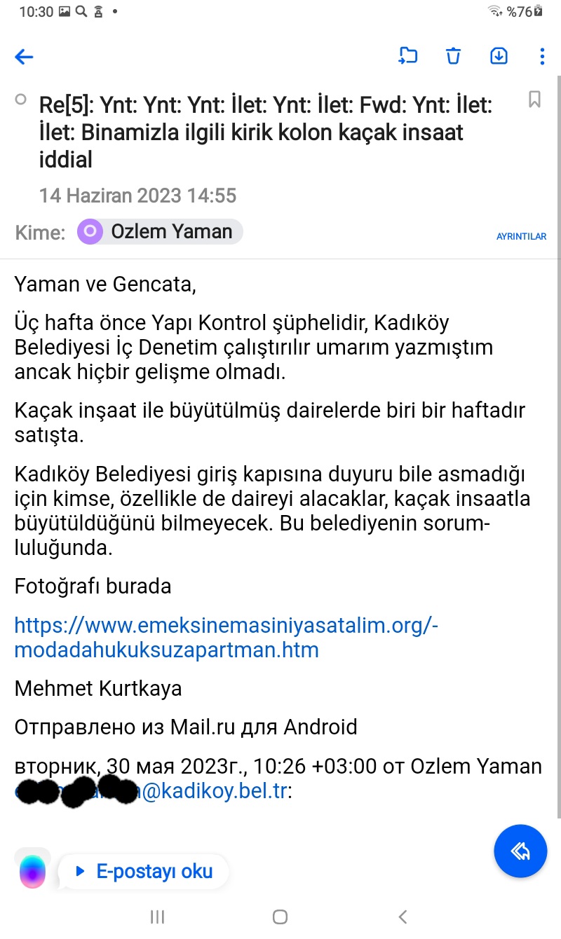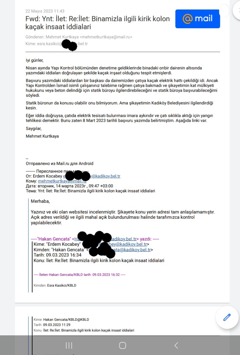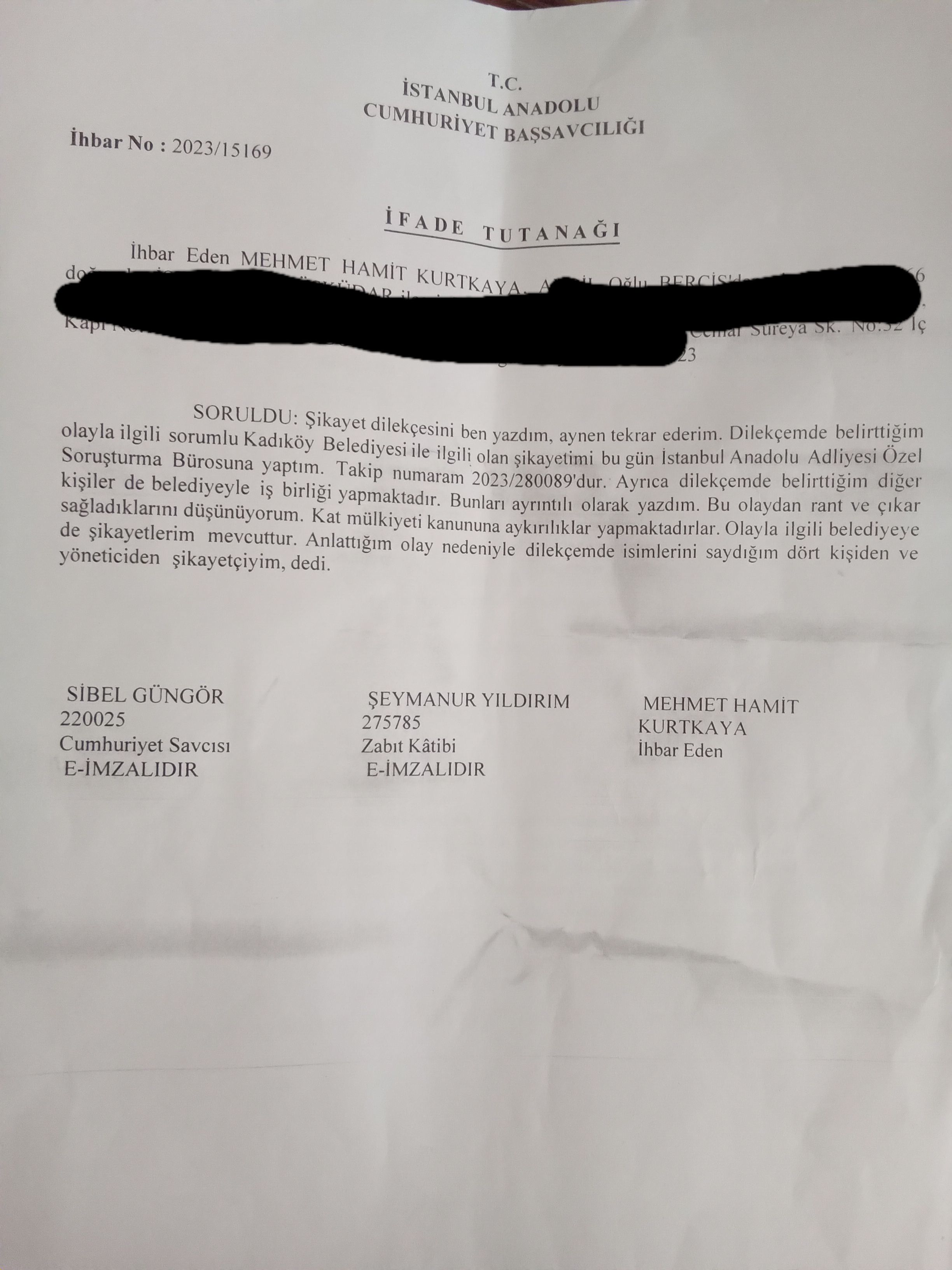 raporla tespit edilmiştir. Uzmanların tamamı kiriş-kolon bağlantısı çatlak/kırık binalara girmeyin diyor. Üstelik bu kırık, binanın yükünü taşıyan bodrumunda! ![]() Mikael Yardım’ın yönetimden ayrılmasını istediğim 2020’den bu yana, bu tabut binada 3 daire satılmış ve bu dairelerde çok kapsamlı/pahalı tadilatlar yapılmıştır. Bu tadilatlardan ikisinin başında Mikael Yardım durmuştur. Bu şahsı apartmana musallat eden ve Almanya’da yaşayan Cüneyt Göksu’ya kat mülkiyetine aykırı apartman kararlarında sonradan vefat eden TSK emeklisi Süleyman Esringü ve binada iki daire sahibi Belinda Günter vekillik etmiştir. TSK emeklisi Süleyman Esringü’nün kaçak inşaatla büyütülmüş bu tabut binadaki dairesi, Mikael Yardım'ın başında durdugu çok kapsamlı bir tadilat sonrasında Lilya İrem Salman’a Volkan Yenilmez tarafından satılmıştır. Ancak ne hikmetse Lilya İrem Salman şikayetçi olmayıp binadakilerle bana karşı birleşmiştir. Daire babamdan kaldıgı icin annemle birlikte hissesi olan ve maalesef kardeşim olan Zeynep Kurtkaya Kayalıoğlu, onlarla birlikte hareket etmiştir. 6.2’lik Istanbul depreminden 2 yıl önce hasar raporu Kadıköy Belediyesi tarafından yazılan ve binada oturum için 1 ay içinde üniversite raporu getirilmesi şart koşulan binaya son deprem ilave hasar verdi mi bilmiyorum. Ancak bina Istanbul'un deprem acisindan en riskli yerlerinden birinde ve pek cok uzmana gore Istanbul'u büyük bir deprem bekliyor. Bir seneden fazla bir süredir örtbası ispatlayan iki belediye belgesini bana husumeti olan kardeşim Zeynep Kurtkaya Kayalıoğlu'na ve SMS mesajı ile iletişim halinde olduğunu söylediği Almanya'da yaşayan Cüneyt Göksu'ya tweetliyorum, cevap vermiyorlar. Zeynep Kurtkaya Kayalıoğlu, tweetlerimden bazılarına WhatsApp ve SMS ile cevap veriyor ama rapor örtbası ile ilgili belgelere cevap vermiyor. En son 1 Mayıs 2025 tarihli WhatsApp mesajında rapor ortbasına yorum yapmadan "karot aldır, binayı yıktır" yazdı. (Not:Resmi belediye raporuna gore zaten belediye ve/veya TC'nin yıkması gerekiyor binayı, ancak yıkmıyorlar, cevap da vermiyorlar.) Hala yapılan rapor ortbas hakkinda yazmadın. Bu örtbasiniz oturduğum evi satılmaz hale getirdi. Yani hem benim ve annemin hayatını riske atıyorsunuz hem daireyi satmama engel oluyorsunuz çünkü bu binada oturulamaz. tivitime cevap yazmadi. Israrla yazmiyor. Bizim bina bodrumda esyasini bedava bulunduruyor ve arabasini bina onune park ediyor ve bu ay (Mayis 2025) Moda'da depreme dayanikli evlerine tasinacaklar. Bu göz göre yapılan rapor örtbasından faydalananlar 1-Mikael Yardım, 2-Volkan Yenilmez 3-Cüneyt Göksu/Baldızı Ayşe, 4-Lilya İrem Salman/Yavuz Salman 5-Nurdan Kıvanç, 6-Sebahattin Keskin/ Denge Site yönetimi (binaya gelmeyen kağıt üzerinde yönetici) 7-Zeynep Kurtkaya Kayalıoğlu ve tabut binada dairelerini kiralayarak rant elde edenler 8-Belinda Günter/Ari Uygun, 9-Pınar Erzen, 10-Avukat Birsen Malkoç, 11-Arman Esayan (önce muhalifti sonra diğerlerine katıldı). İlaveten daireye geldiğine dair emare bulunmayan 12-Noter Tülay Cihangir ve 13-Rapor örtbası sırasında daire alan ve cok kapsamli tadilat yapan ve binada oturan İrem Düzovalılar. Bunlardan ilk sekiz maddede yer alan toplam 11 şahıs bina yönetiminde aktif: 11 dairenin 5i artı bizim dairede hissesi bulunan Zeynep Kurtkaya Kayalıoğlu. Bunlar birincil derece çıkarı olan ve birlikte hareket eden şahıslar, yasaları birlikte cigniyorlar, diğerleri bunlara uymakta. Benden başka binada dairesi olup da Kadıköy Belediyesi rapor örtbasına itirazı olan yok. 1 Aralik 2023'te binadakiler ve Kadıkoy Belediyesi hakkinda suc duyurusunda bulundum. Bassavciligin sorusturma baslattigi dilekcem nedeniyle, ve ifade tutanaginda sorusturma nosu olmasina ragmen, ayni gun aleyhime ortbas/susturma amacli vesayet davasi basvurusunda bulunuldu. Bassavciligin sorusturma yuruttugunu bilmesine ragmen, bir baska savci Huseyin Onelge resmi belgelere ragmen "tamamen soyut" yazarak takipsizlik karari verdi. Beni ve maalesef kardeşim olan Zeynep Kurtkaya Kayalıoğlu isimli şahsı 50 senedir tanıyan avukat Kemal Kaya, vesayet davasini kardeşim ve apartmandaki birkaç kişinin açtığını, 8 Haziran 2024'te telefonla arayarak söylemiştir. Dilekçemde Lilya İrem Salman'ın babası Yavuz Salman ve Cüneyt Göksu'nun baldızı Ayşe hakkında huzur ve sukünumu bozdukları olaylardan bahsetmistim. Nurdan Kivanc dahil bunlar zaten benim şikayetimle dairelerindeki kaçak inşaat yıkılmış, ceza ödemiş şahıslar. Ayrıca vesayet başvurusunun öncesinde, binadakiler hakkında belediye raporunu örtbas ettirdikleri için suç duyurusunda bulunmuştum. Bu yazı ilk yazıldığı 8 Mart 2023 tarihinden beri güncellenmektedir ve o nedenle çok uzundur. Detayli bilgi edinmek isteyenler icin 26 Kasım 2024 tarihli aşağıdaki güncelleme oldukça aydınlatıcıdır. İstanbul Kartal Anadolu Cumhuriyet Başsavcılığı’nın İçişleri Bakanı’nın eski Kadıköy Belediye Başkanı Serdil Dara Odabaşı hakkında soruşturma izni vermemesi üzerine verdiği takipsizlik kararına 10 Ekim 2024 tarihli itirazım bu güncellemenin devamındadır. Itirazimda can guvenligi riski bir an once bertaraf edilmelidir yazmama ragmen yaklasik 1 senedir TC devleti tabut binaya mahkumiyetimi devam ettiriyor. ÖZET SONU - GÜNCELLEMELER VE İDDİALARIMIN BELGELİ KANITLARI GÜNCELLEME 26 KASIM 2024 TARİHLİ ÖZET- Daire sahipleri binada oturum için şart kılınan üniversite raporunu ısrarla getirmemesine rağmen belediye ısrarla yasal işlem yapmadığı için binanın her an olabilecek Istanbul depreminde yıkılma riski 18 aydır devam ediyor. Belediye binaya 1 ay süre vermişti. - Kadıköy Belediyesi kendi dürüst mühendislerinin hazırladığı raporu üç kez üstüste örtbas etti. 10 ayda toplam 22 kamu görevini kötüye 