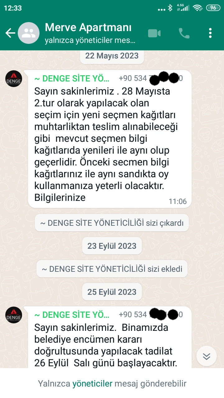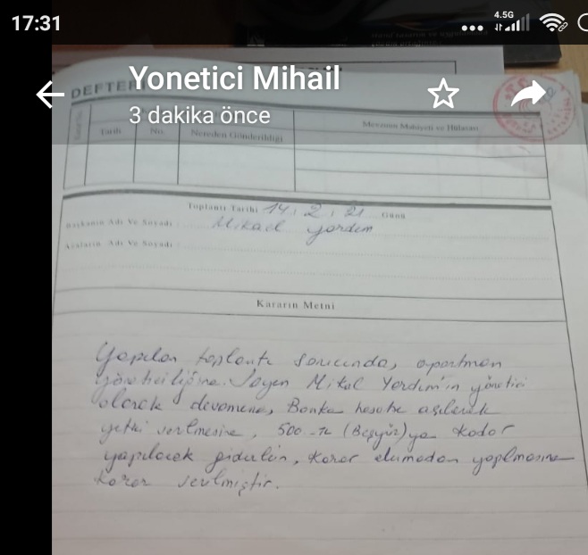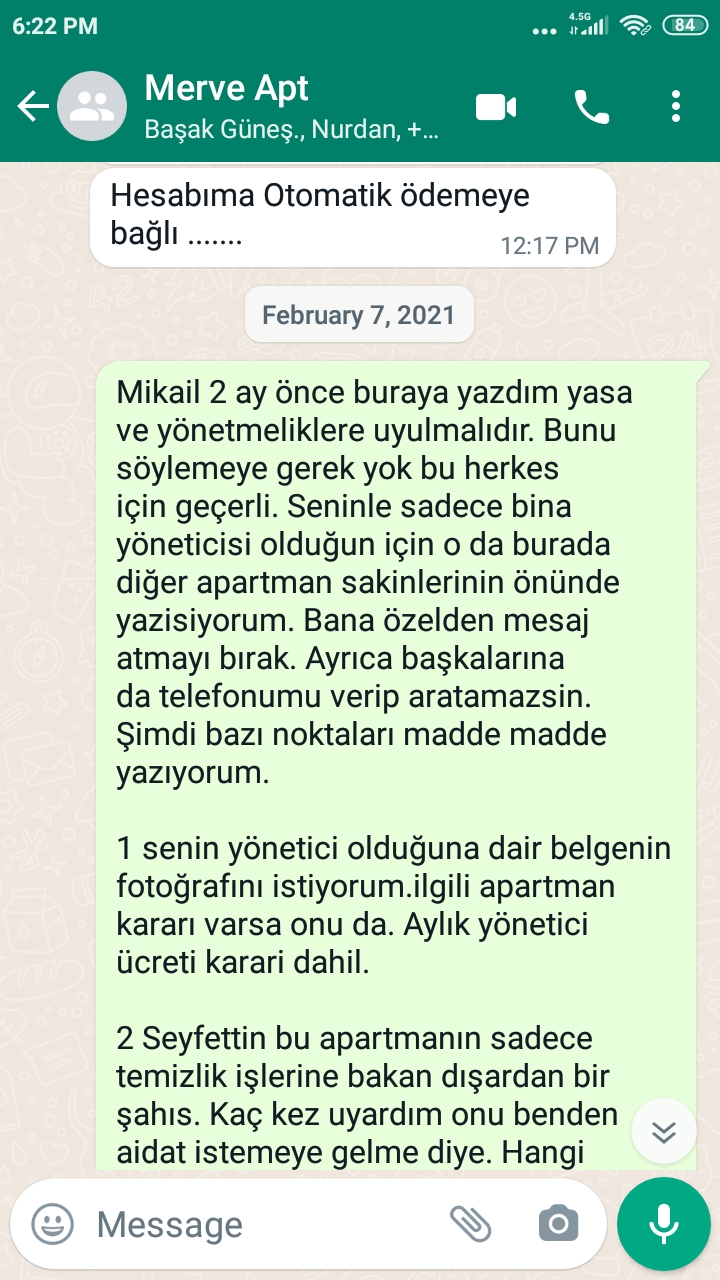 2011 yılında bir sene için, denetçi seçimi yapılmadan dışarıdan ücretli apartman yöneticisi seçilmiş olan Mikael Yardım, vergi numarası olmadan, yöneticilik ücreti faturası kesmeden, harcamalara fatura almadan, defter tutmadan, dairelerini kaçak inşaatla büyütenlerin desteğiyle (11 daireden 6’sı aydınlık boşluğunu kapatarak dairelerini yüzde 6–7 büyütmüş), 10 sene denetçisiz yöneticilik yapmıştır. Apartmanın ortak alanlarını, (otopark, bahce) kızı Belinda Günter’in kiracılarına kullandırtarak ilave rant elde etmiştir. 2021 basında ben yöneticilikten ayrılmasını isteyince Mikael Yardım Range Rover cipine 12 Eylül askeri darbe döneminden kalma bir TSK giriş kartı koyup yönetimde devam etmiştir. Kagıt uzerinde dısardan profesyonel bir yonetici secilmis (Sebahattin Keskin/Denge Site Yonetimi) ve hukuksuzluklar devam etmistir. 21 Mart 2023 tarihli belediye denetimi sonucu yonetimin: