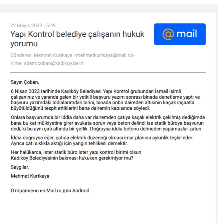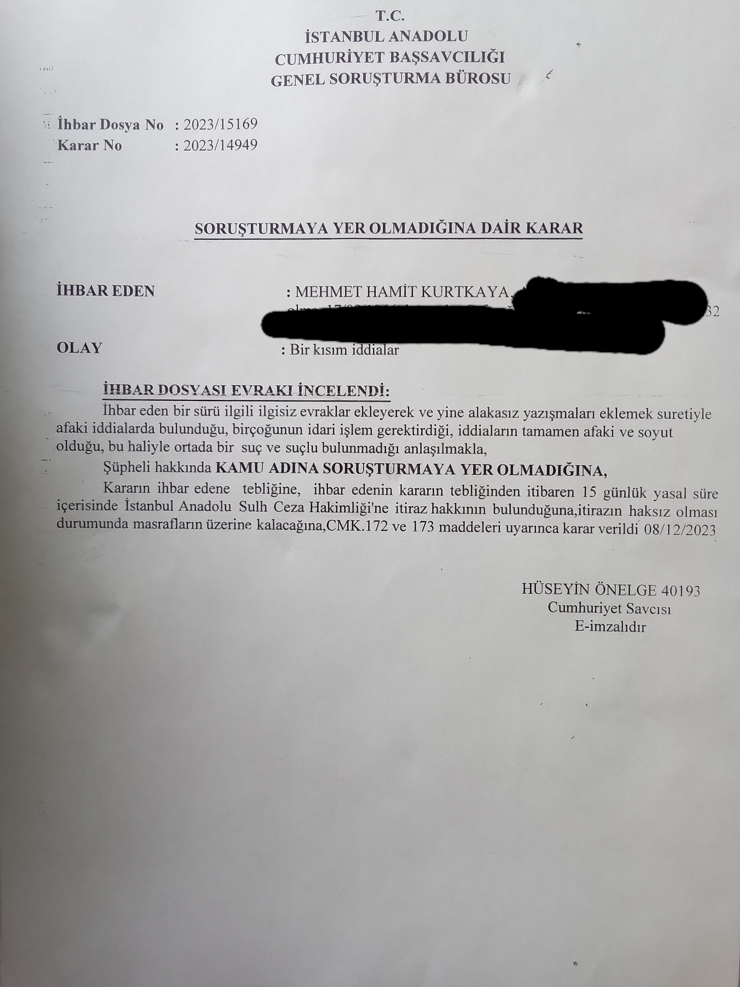 Yukarıdaki metin sadece itiraz dilekçemin özetinin sonudur ve bu özet okuma kolaylığı açısından tamamen yapay zeka tarafından hazırlanmıştır ve itiraz dilekçemin parçasıdır. İtiraz dilekçemin ana metni ektedir. 1- Savcılığa bir vekil ile başvurmamıştım, şahsen başvurmuştum. Başsavcılık yazısında İçişleri Bakanlığı'nın tebligatı vekile yaptığı yazıyor. Neden bir vekilden bahsediliyor ve İçişleri Bakanlığı kime tebligat yapmıştır bilmiyorum, ancak bana bir tebligat gelmedi, tebligat bilgisi de verilmedi. O nedenle İçişleri Bakanlığı'na itiraz edemedim. Başsavcılık tebligatı ev adresimde bana yapmıştır, İçişleri Bakanlığı'nın da aynı şekilde bana tebligat yapması gerekirdi. Başsavcılık başvurunun şahsen yapıldığı ve tebligatın kişiye yapılması gerektiği konusunda İçişleri Bakanlığı'na itiraz etmeliydi. Buna ilaveten, yazıda yer alan vekilden kasıt yıllar önce bir davada avukatlığımı yapmış olan Serkan Dinçol ise onun vekalet ücretini davayı kendisi açmak istediği için kardeşim Zeynep Kurtkaya Kayalıoğlu ödemiştir. Serkan Dinçol ben belediyeye başvurmadan aylar önce, 2022 yılında, kendisine binadaki durumu anlatıp avukatlığımı yapmasını istediğimde yeni dava almadığını söylerek beni bir başka avukata yönlendirmişti ve yönlendiridiği avukatla çalışmadım, o avukata vekalet de vermedim. Dolayısıyla avukat Serkan Dinçol'un bana vekalet edebilecek bir durumu yoktur. Vekil olarak kimden bahsedildiğini bilmiyorum. Herhangi bir tebligat veya tebligat bilgisi almadım, dolayısıyla İçişleri Bakanı'nın neden soruşturma izni vermediğini bilmiyorum. Ancak tekrarlayayım, tebligatın başvuruyu yapan olarak bana yapılması gerekirdi, nitekim başsavcılık tebligatı bana yaptı, ben de aldım. 2- Başsavcılık mevcut delillere dayanarak karara itiraz etmeliydi. Sebeplerini aşağıda yazdım. Buna ilaveten yeni deliller ışığında (aşağıda yer alan maddeler 8, 9, 10, 11) ya karara itiraz etmelidir ya da yeni başvuru yapmalıdır. 3- Suç iddialarım tamamen somuttur, çünkü Kadıköy Belediyesi resmi raporu ve Kadıköy Belediyesi ile yazışmalarıma dayanmaktadır. Aylarca örtbas edilen Kadıköy Belediyesi Bina Raporu, Kadıköy Belediyesi'nin bana yazdığı yazılar ile karşılaştırıldığında Belediyenin ısrarla işlediği suçların varlığı, ben dahil kimsenin tanıklığına ve ifadesine ihtiyaç duymadan, yazılı belgelerle kanıtlanmış durumdadır. Buna ilaveten belediyenin bana yazdığı yazılar birbirleriyle karşılaştırıldığında çelişkiler, yalanlar ve kasıt hiçbir şüpheye yer vermeyecek şekilde ortadadır. 4- Belediyenin kamu görevini kötüye kullanmasının sonuçları hukuken ve fiilen devam etmektedir. Kadıköy Belediyesi resmi raporunda bina taşıyıcı sistemi üzerinde şüphe oluştuğu ve binanın iskan edilip edilemeyeceğine daire sahiplerinin 1 ay içinde ivedilikle getirmesi zorunlu tetkik ve tahlilleri içeren Bina Performans Üniversite raporuna göre karar verileceği yazılmıştır. Aksi takdirde Belediyenin 1 ay içinde İmar Kanuna göre işlem yapacağı yazılmıştır. Daire sahipleri ve apartman yönetimi şart koşulan raporu getirene veya Belediye yasal işlem yapana kadar oturanlar ve kamu için can güvenliği riski olduğu tartışmasız, raporun doğrudan sonucu olan bir gerçektir. Yani kamu görevini kötüye kullanma suçunun benim, binadakilerin ve çevrenin can güvenliğini, yani kamu güvenliğini doğrudan etkilemeye devam eden fiili bir durum yarattığı tartışmasız bir gerçektir. 5- Daire sahiplerinin binanın iskanı için şart koşulan üniversite raporunu 1 ay içinde almamasına rağmen belediyenin yasal işlem yapmadığını gören yetkililer (Kadıköy Belediyesi, Adalet Bakanlığı, İçişleri Bakanlığı) kamu güvenliği adına müdahale etmek zorundaydı. 6- T.C. devletinin taraf olduğu Uluslararası Sözleşmelerden ve Anayasadan doğan can güvenliğimi sağlama, barınma ve mülkiyet haklarım yerel yasalara göre öncelik taşımaktadır. Yani fiilen devam eden can güvenliği riskini bertaraf etmek hukuki ve insani öncelik taşıyan bir zorunluluktu. Bu zorunluluk halen devam etmektedir. Yukarıda bahsettiğim nedenlerle şikayetim üzerine soruşturma başlatılmalıydı. Bu yapılmayarak yukarıda bahsettiğim Uluslararası sözleşmelerden doğan en temel İnsan Haklarım ihlal edilmiştir ve halen de bu durum devam etmektedir. Dürüst ve vicdanlı olduğum için oturduğum dairedeki payımı başkasına satamam, daireyi kiralayamam, yani mülkiyet hakkım da fiilen elimden almıştır. 7- Kadıköy Belediyesinin kamu görevini kötüye kullanma suçu 10 aylık süreçte, üç aşamada ve toplamda 22 farklı eylemle gerçekleştirilmiştir. Bunlardan bazıları tek başına dahi suçu ispatlamaya yeterlidir. Madde madde yazılı kanıtlar aşağıda belirtilmiştir. Kahramanmaraş depreminden 1 ay sonra, 8 Mart 2023'te, Kadıköy Belediyesi'ne binamızda hukuksuzluk düzeni kurulduğu, kaçak inşaatlar olduğu ve apartman yönetiminin kolon kırığı gizlediği iddiaları ile iddialarımı yayınladığım web sayfamın linkini vererek başvurmuştum. Bu iddialarım Belediye tarafından tamamen kanıtlanmış durumdadır. 21 Mart 2023 tarihli Kadıköy Belediyesi Resmi Raporu'nda bodrum katındaki apartman ortak alanında apartman yönetimi tarafından bir kolondan boru geçirilmesi ve bir başka kolondan kirişin çıkması nedeniyle bina taşıyıcı sistemi hakkında şüphe oluştuğu yazılmıştır. Rapora göre, daire sahiplerinin ivedilikle 1 ay içinde Bina Performans tetkiklerini içeren Üniversite raporu getirmesi zorunludur, aksi takdirde Imar Kanuna'na göre yasal işlem yapılacağı yazılmıştır. Bina 47 yıllıktır, betonu deniz kumuyla yapılmıştır ve Istanbul Büyükşehir Belediyesi'nin rapor