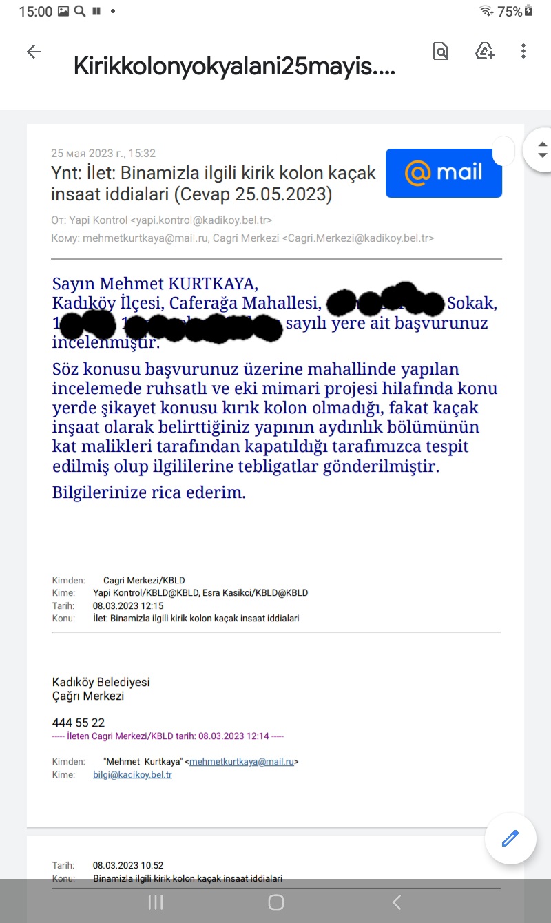 Resmi belgelerle sabit "tabut bina" ve İstanbul depremine geri sayım... Aşağıdaki iki yazı ilk örtbası belgeliyor. Kadıköy Belediyesi 2,5 ay boyunca denetim sonucu ile ilgili taleplerime cevap vermedi, sonunda 21 Mart 2023 tarihli raporu gizledi ve kırık kolon yok yalanı ile başvurumu 27 Mayıs 2023'te sonlandırdı.